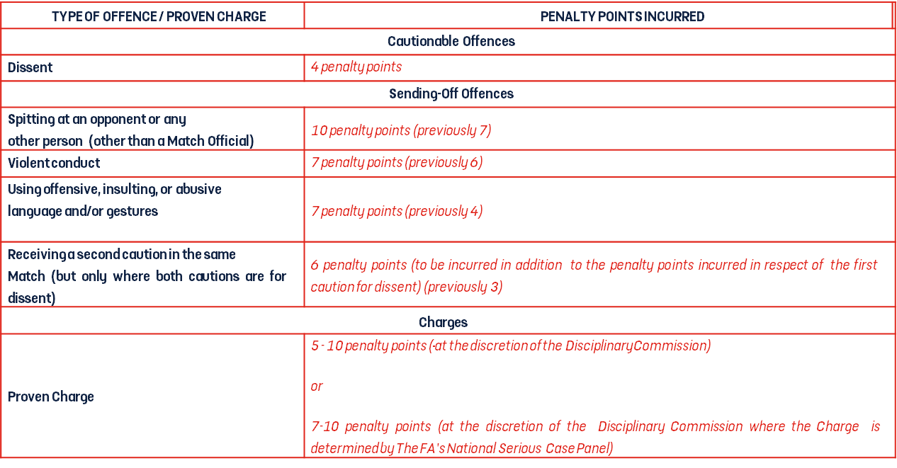 100 pts | An FA charge, plus further sanctions if found proven. Ultimately, ongoing accumulation of penalty points can lead to the suspension or removal of England Football Accreditation and/or affiliation. |